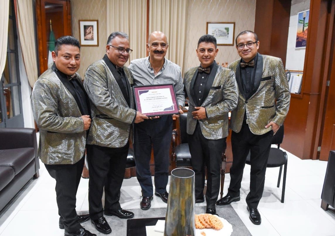 Xalapa, Ver.- Por su participación en el Programa Noches Culturales, el presidente municipal Ricardo Ahued Bardahuil entregó un reconocimiento a los integrantes del Trío Coatepec y Los Dandy’s de Armando Navarro, quienes ofrecieron un concierto de bolero y música romántica en el Patio Central de Palacio Municipal.