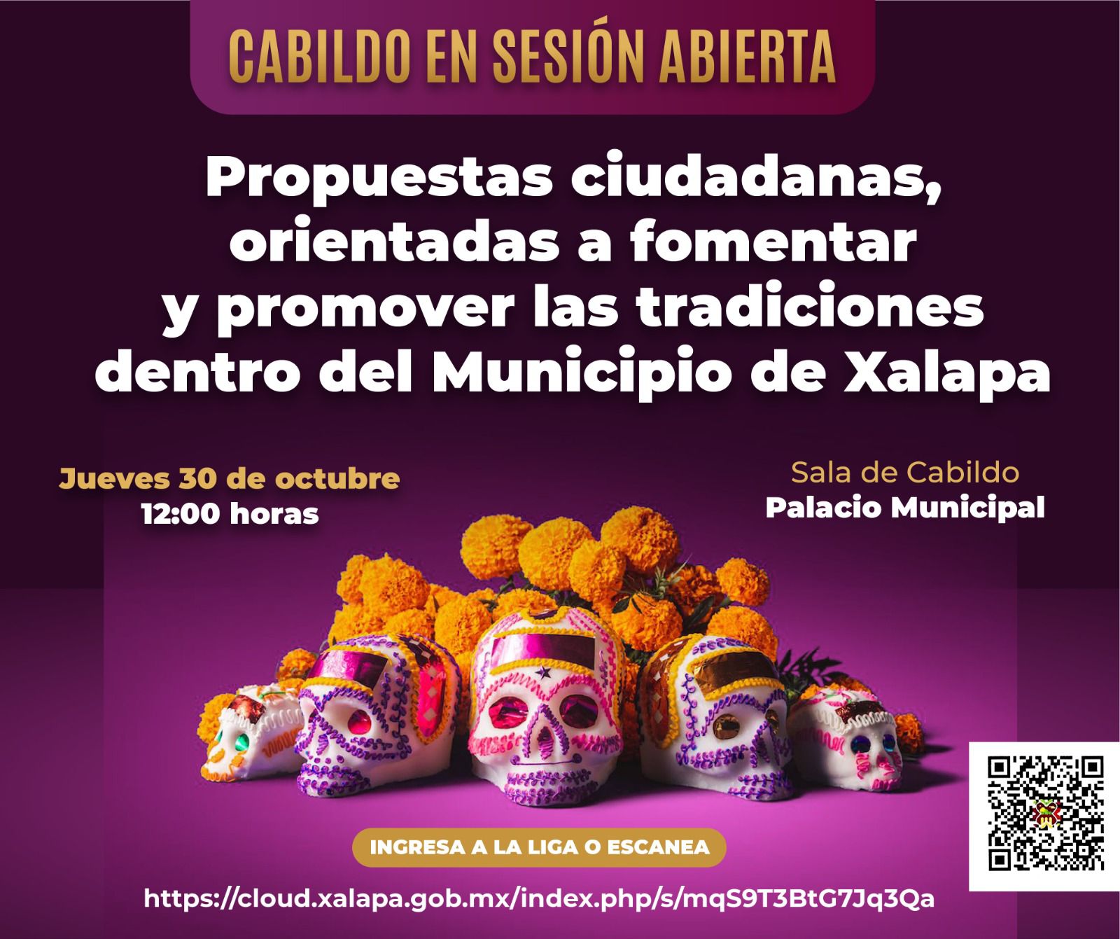 Xalapa, Ver.- Con el propósito de recibir, escuchar y analizar propuestas ciudadanas orientadas a fomentar y promover las tradiciones en el municipio de Xalapa, el próximo jueves 30 de octubre, a las 12:00 horas, se realizará el quinto Cabildo en Sesión Abierta del año, por lo que se invita a la ciudadanía a participar y presentar sus iniciativas en la materia.