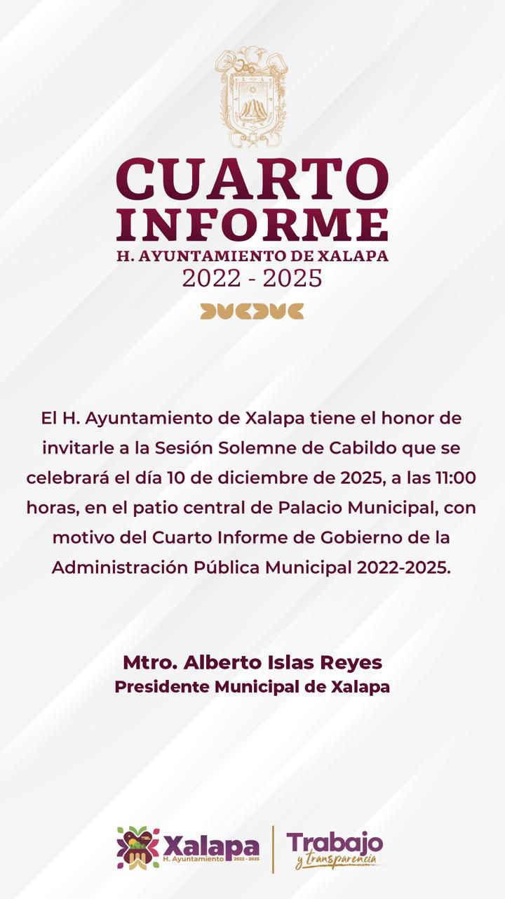 Xalapa, Ver.- En cumplimiento a los ordenamientos legales y los principios de transparencia y rendición de cuentas, el próximo 10 de diciembre, a las 11:00 horas, el alcalde Alberto Islas Reyes rendirá el Cuarto Informe del Estado que Guarda la Administración Pública Municipal 2022-2025.